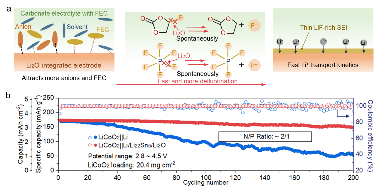 10月8日,長江大學化學與環(huán)境工程學院肖圍教授課題組在高性能鋰金屬電池領域取得重要研究進展,其成果"Li2O-Integrated Electrodes Enabling Enhanced Adsorption/Defluorination Kinetics toward LiF-Rich Interphase for High-Performance Lithium Metal Batteries"發(fā)表于國際頂級學術期刊Advanced Functional Materials。該研究創(chuàng)新性地通過電極設計,集成對碳酸酯電解液中含氟組分吸附/去氟化能力強的納米氧化物,在金屬鋰電極表面原位構筑了化學/電化學穩(wěn)定的含氟保護層,改善了鋰金屬負極的電化學性能。李國成博士為論文第一作者,肖圍教授為論文第一通訊作者,長江大學為論文通訊第一單位。 內容簡述: 鋰金屬負極因其極低的氧化還原電位和極高的理論比容量,被視為下一代高能量密度電池的理想選擇。然而,其實際應用受限于較差的循環(huán)穩(wěn)定性,主要歸因于與碳酸酯電解液的高反應性。這種反應導致形成不穩(wěn)定的固體電解質界面(SEI),在循環(huán)過程中易破裂,持續(xù)消耗活性鋰和電解液。同時,天然SEI在組成、形貌和離子導率上的不均勻性會引發(fā)鋰離子通量分布不均和成核位點雜亂,進而導致枝晶生長和電池短路。構建穩(wěn)定均一的SEI層成為抑制副反應和枝晶問題的關鍵。研究發(fā)現,富含LiF等無機成分的SEI可有效提升界面穩(wěn)定性。現有策略(如高濃度電解液、添加劑和表面修飾)主要通過調控電解液組成或界面化學來促進含氟物種分解生成LiF,但往往依賴復雜配方或精密工藝。相比之下,從電極設計入手,開發(fā)能高效吸附并促進含氟組分去氟化的新方法,為構建穩(wěn)定富LiF界面提供了更具潛力的替代路徑。 本研究提出了一種通過調控復合電極對含氟電解質組分的吸附與去氟化動力學,以定向構筑富LiF界面的新策略。采用機械化學方法,在Li/Li22Sn5復合電極中實現了Li2O納米顆粒的原位、均勻嵌入。研究表明,Li2O對PF6?和氟代碳酸亞乙酯(FEC)具有強吸附能力,可加速其自發(fā)去氟化過程,進而引導形成以陰離子/FEC衍生物為主的富LiF 固體電解質界面。結合光譜學表征與理論計算,證實了Li22Sn5表面對含氟物種具有優(yōu)先吸附與去氟化促進作用具有優(yōu)先吸附與去氟化促進作用,揭示了該界面結構的形成機制。同時,穩(wěn)定的Li22Sn5合金骨架有助于引導均勻鋰沉積并緩沖體積變化,與Li2O協(xié)同增強電極穩(wěn)定性。該復合負極在碳酸酯電解液中實現50次循環(huán)內平均庫侖效率99.0%。與LiCoO2正極組裝的完整電池在苛刻條件(N/P = 2:1,貧電解液20 μL)下表現出優(yōu)異的循環(huán)穩(wěn)定性,面容量為3.3 mAh cm?2,200周后容量保持率達87.0%;180 mAh軟包電池在100次循環(huán)后仍保持78.2%的容量,充分證明了該電極設計策略的實際應用潛力。 該研究工作得到了國家自然科學基金(52272207和52274292)、北京自然科學基金(2192029)、湖北省杰出青年基金(2020CFA090)等項目的支持。 圖文摘要: 圖(a)Li/Li22Sn5/Li2O電極吸附/去氟化構筑富含LiF固態(tài)電解質界面層示意圖;(b)LiCoO2||Li/Li22Sn5/Li2O、LiCoO2||Li電池循環(huán)性能對比圖。 文章鏈接:https://advanced.onlinelibrary.wiley.com/doi/epdf/10.1002/adfm.202523194 (審核:肖圍 編輯:常艷玲)